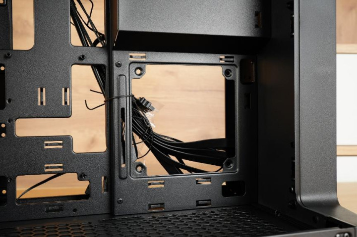 先马巨浪3的主板架前部区域也是不同于普通海景房的,普通海景房这里一般是2-3把的风扇支架,而巨浪3则是把电源仓放到里此处,仅留下底部的一个12CM风扇位,这也是巨浪3为何厚度不高的主要原因。