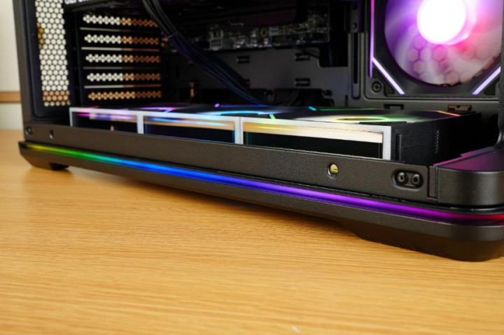 机箱底部的塑料底座周围有一圈的嵌入式ARGB灯带,亮机后能够通过漫反射展示灯效,非常的好看。