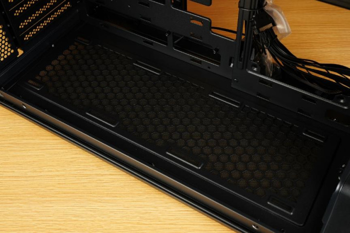 机箱底部的同样设有风扇支架,标配有磁吸防尘网,可以支持3把12CM风扇的安装。